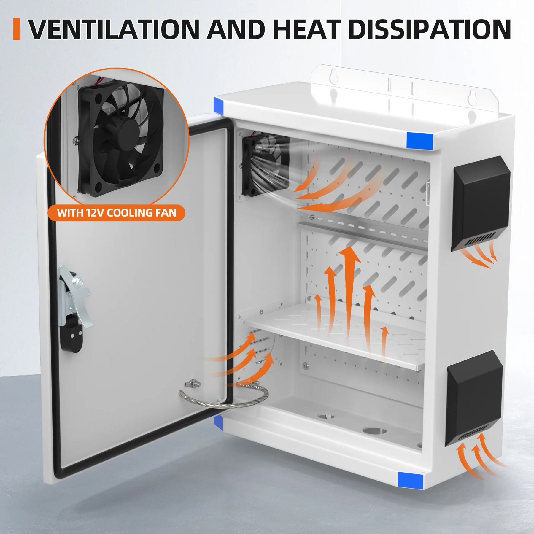 【Effiziente Wärmeabteilung】- Der Anschlussbox wurde für eine optimale thermische Behandlung ausgelegt. Es ist mit einem 12 -V -Kühlventilator (80 x 80 x 10 mm) ausgestattet und umfasst zwei Belüftungsschlitze auf jeder Seite, um einen effizienten Luftstrom zu erleichtern. Diese Kombination von Merkmalen stellt sicher, dass die durch interne Geräte erzeugte Wärme schnell und effektiv abgelöst wird, was eine Überhitzung verhindert.