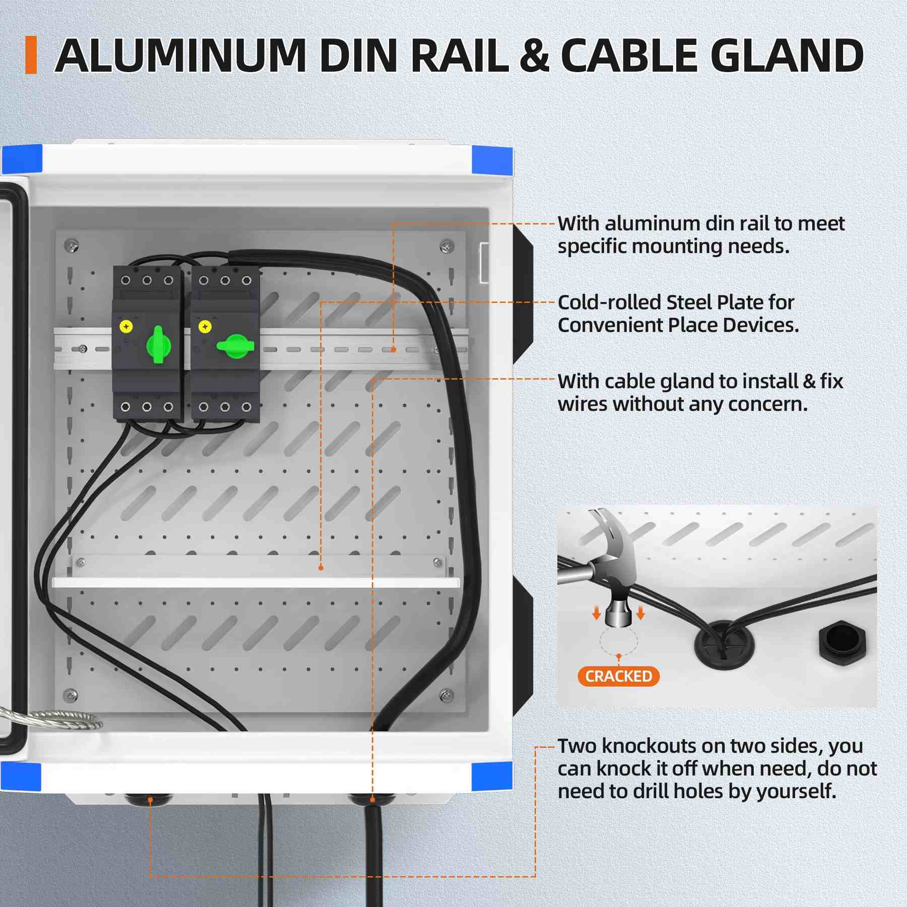 【Einfache und vielseitige Installation】- Das Gehäuse verfügt über zwei vorgeschnittene Knockout-Löcher unten, um den Kabeleintritt zu vereinfachen und die Bedürfnisse für manuelle Bohrungen zu beseitigen. Es umfasst auch Hardware und Reifen aus rostfreiem Stahl, sodass Benutzer zwischen Wandmontage- oder Pole-Montaging-Konfigurationen für vielseitige Installationsoptionen wählen können.
