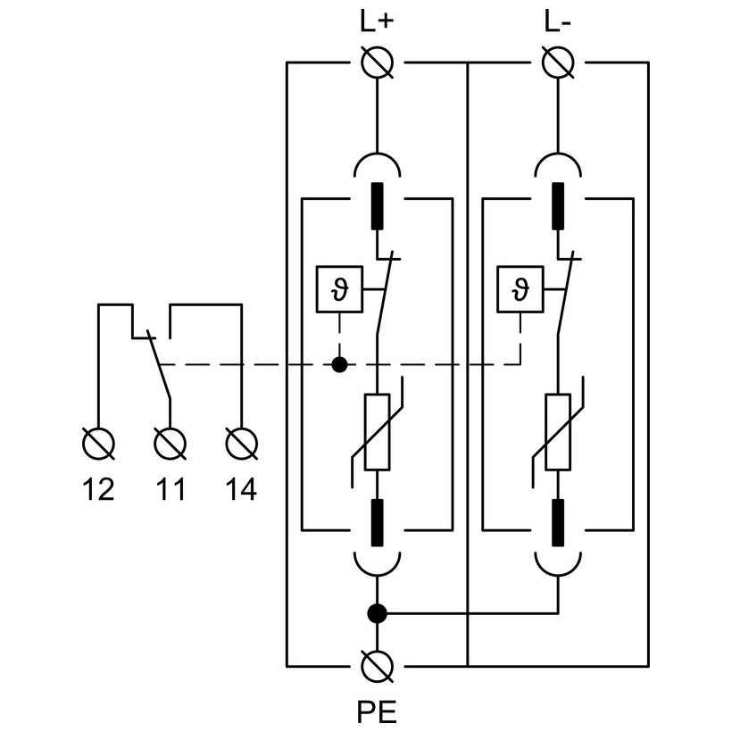 Bestimmte Varistorsektoren zwischen L+, L- und PE sind jeweils mit internen thermischen Trennschriften ausgestattet. Wenn ein Varistor am Ende des Lebens (Überhitzungen) erreicht wird, weist die Trennstöcke sichtbar, die einen Fehler und den DC-Strom unterbrechen. Dank ihrer besonderen Konstruktion können diese Verhaftungen ohne separate Sicherungssicherung installiert werden (vorbehaltlich der Systemkoordination).