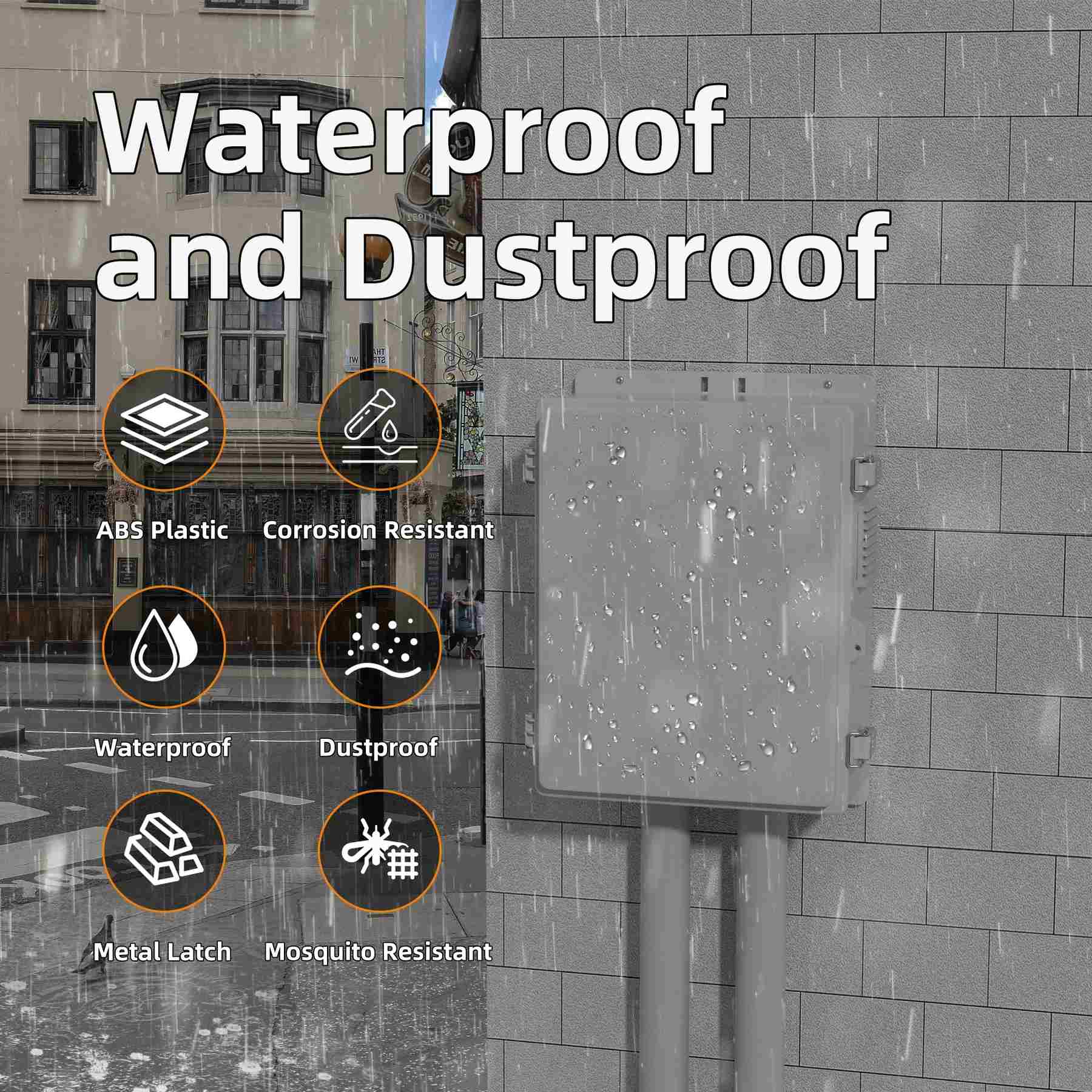 【Langlebige, wetterfeste und sichere Konstruktion】- Die Schachtel wird aus hochkarätigem ABS-Kunststoff hergestellt, wodurch sie korrosionsbeständig und gegen UV-Schäden resistent ist, wie durch die Ikonen angezeigt, die zeigen, dass sie wasserdicht, korrosionsbeständig, mückenfest ist und eine Metallriegel zum weiteren Versiegelung hat. Das Gehäuse ist auch IP65 wasserdicht und staubdicht und verfügt über sichere Metallriegel.